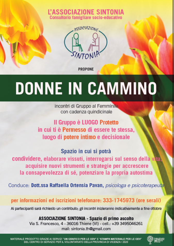 "Donne in cammino" è un progetto a cui prendono parte gruppi di donne coordinati dalla nostra psicoterapeuta Raffaella Ortensia Pavan. L’approccio è quello del Metodo Berniano per sviluppare una terapia individuale all’interno di un contesto di gruppo.