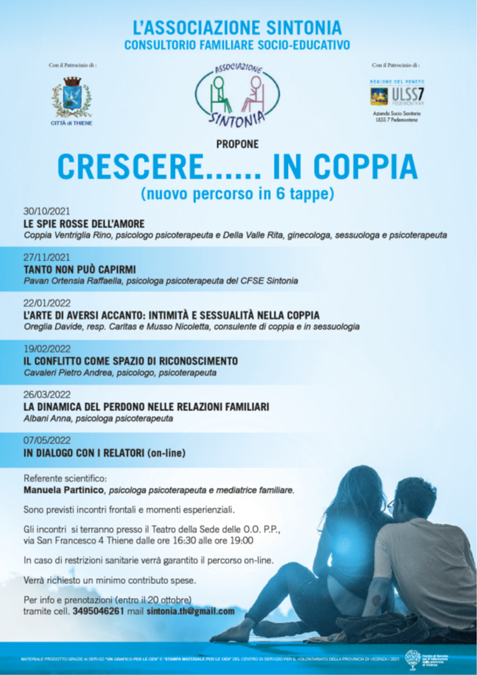 Negli anni 2021-2022 si sono svolte due edizioni del percorso "Crescere... in coppia". Il percorso ha visto la partecipazione di qualificati relatori provenienti da tutta Italia; le tematiche trattate sono quelle relative alla vita di coppia.